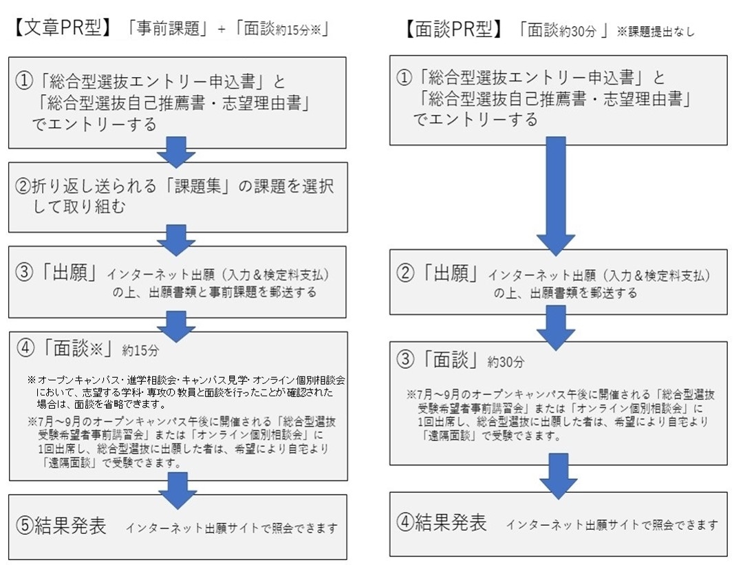 【文章PR型】と【面談PR型】から選べます - オープンキャンパスにて学科の先生と事前面接の場合は、文章PR型(課題提出)選択で受験日の面談を省略できます