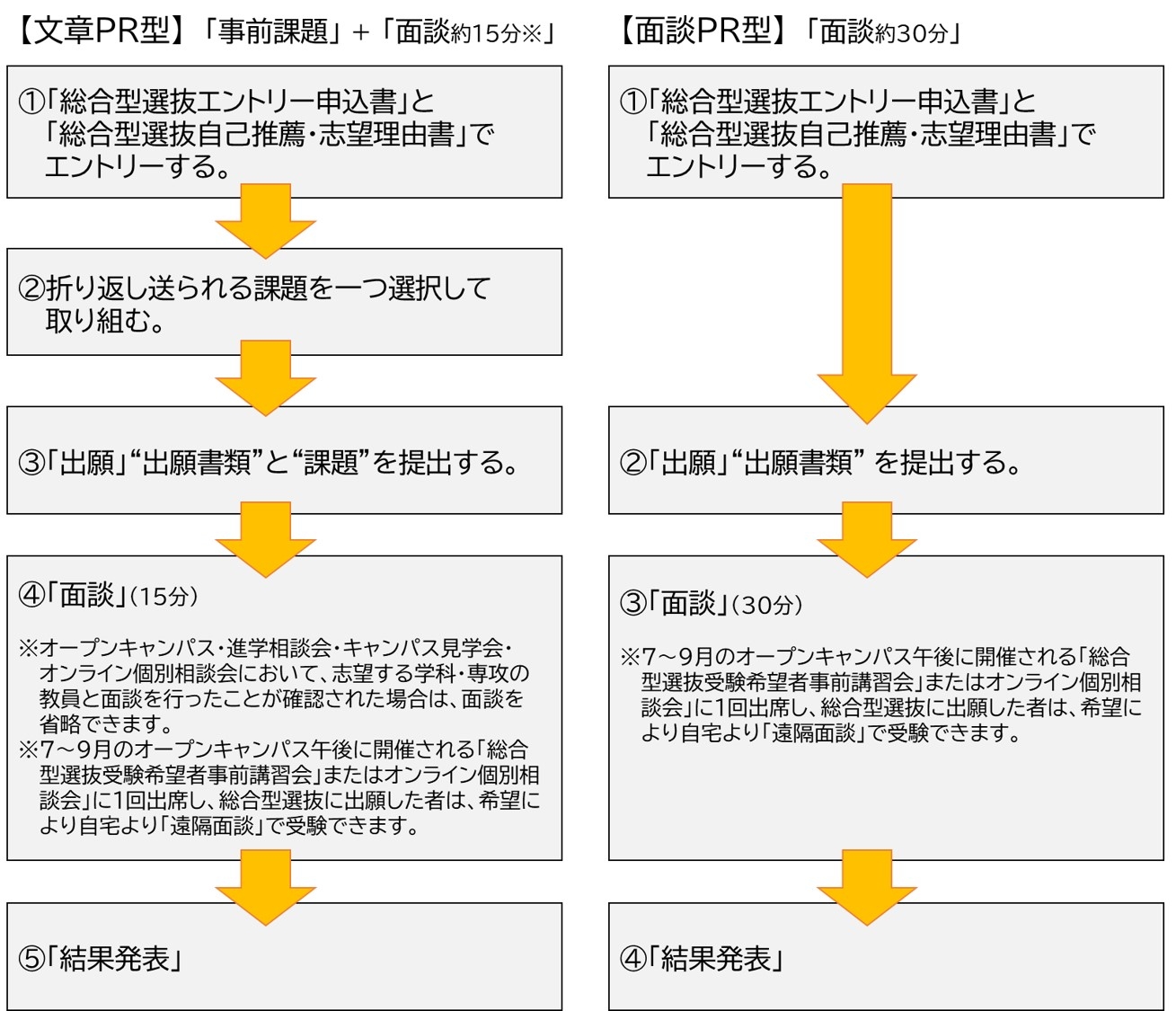 【文章PR型】と【面談PR型】から選べます - 【文章PR型】で受験希望する方は、オープンキャンパス・進学相談会・キャンパス見学会・オンライン個別相談会において、志望する・専攻の教員と面談を行ったことが確認された場合は、面談を省略できます