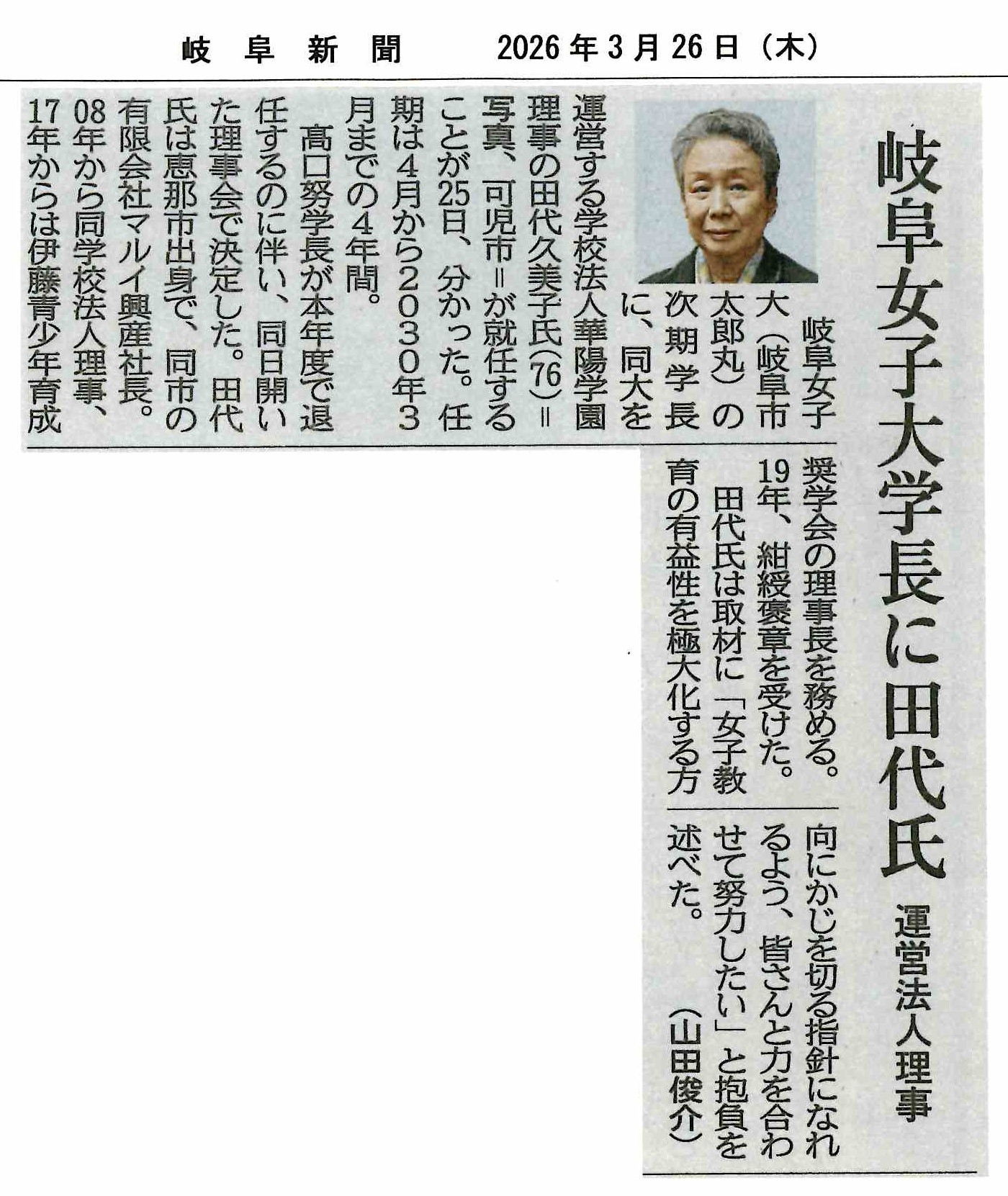 令和8年3月25日岐阜女子大学理事会にて、新学長が田代久美子氏に決定しました。現職に関しては、平成20年4月より学校法人杉山女子学園(現 華陽学園)理事(現在に至る)。平成29年7月より、公益財団法人伊藤青少年育成奨学会理事長(現在に至る)。(岐阜新聞社提供/2026年3月26日岐阜新聞掲載記事)