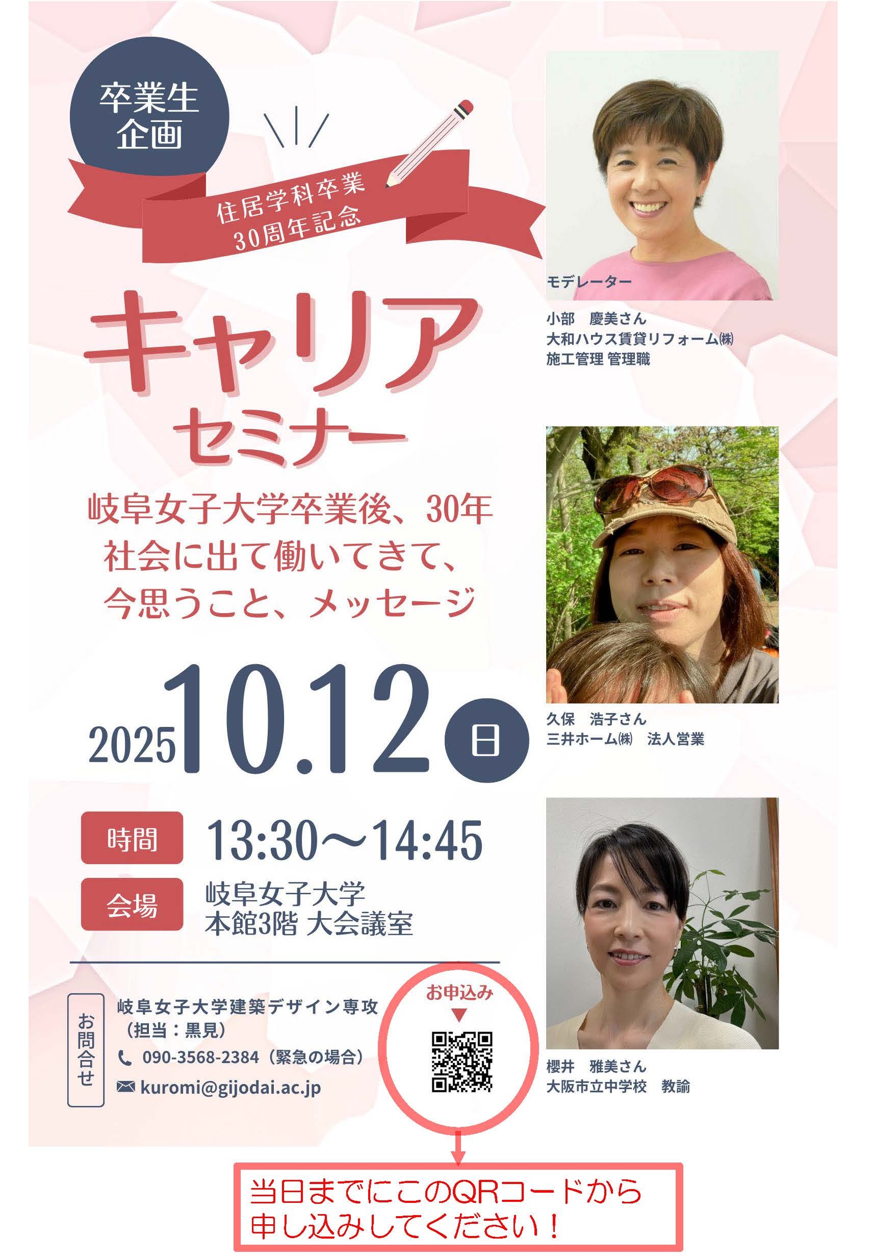 今週末はさぎ草祭! 建築デザイン専攻では11(土)、12(日)に災害時浴室棟の公開と、活動紹介のパネル展示を行います。 また11日は「わたしの住まいリフォームデザイン案コンテスト」の表彰式も予定しております。 そして、12日には30年前の住居学科卒業生が同窓会にあわせて「キャリアセミナー」を開催します! 在学生も参加予定です。ご興味のある方はQRコードから申込いただきますよう、お願いいたします。 そして建築デザインのパネル展示では、過去に行った空き家リノベーションの様子や、現在進行中のプロジェクトについての様子をご紹介いたします。 さらにタイルを使ったワークショップなども行います。 皆さんぜひお越しください!お待ちしております。 ↓過去の様子 |