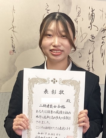 私は短大から3年次編入をしました。二級建築士の受験資格があったため、在学中に絶対取得しようと思っていました。しかし、二次の製図試験がなかなか突破できませんでした。夏休みも毎日のように登校し、学習会に参加し、製図に明け暮れました。合格することができ、ほっとしています。建設会社から内定をいただいており、4月からさっそく役立てていきたいと思っています。今後は一級建築士も目指していきます。