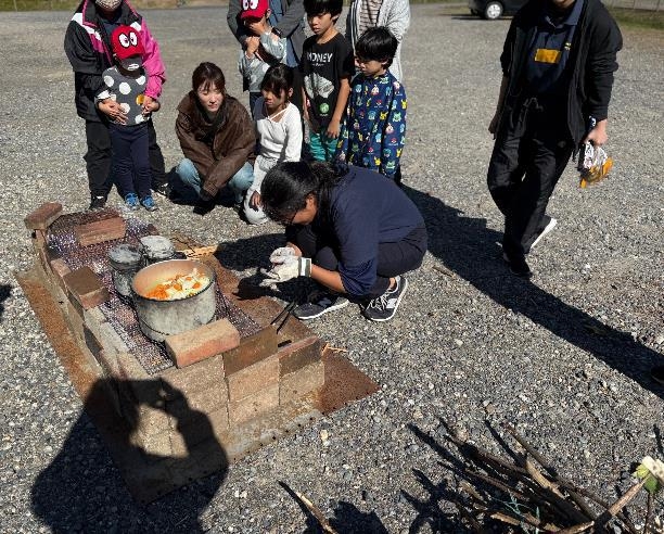 | 始めに、育ててきたピーマンや茄子の葉の形や色の違いをクイズで当てる、活動の振り返りをしました。 | 構内でブロックやレンガを集め、枯れ枝や古い木を拾って、準備に時間をかけた。肉を使わないカレーに、親子が「おいしいー」と歓声を挙げてくれました。 |